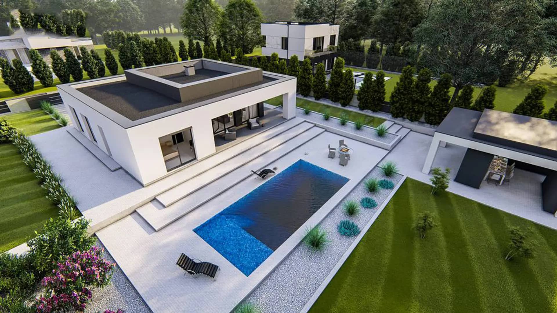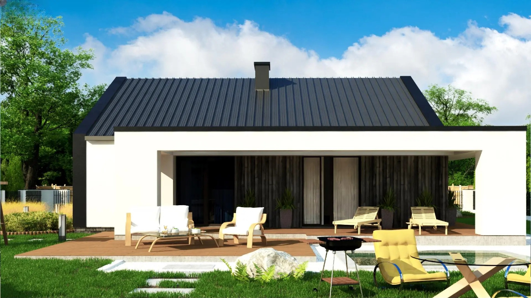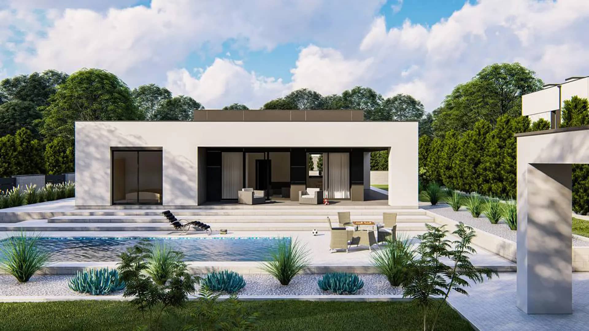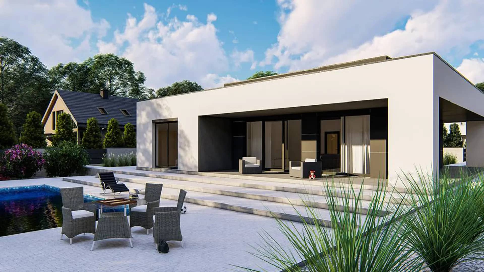 Стильный одноэтажный дом с плоской крышей и просторной террасой для отдыха.